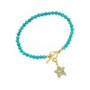 Our bright 3.5-4mm round stabilized turquoise bead bracelet shines with an 18kt yellow gold over sterling silver toggle clasp centerpiece. Wear this stylish statement as is, or customize with your favorite charms for a look that's special to you. Turquoise bead toggle bracelet. Stone InformationGem Type 1: Stabilized-TurquoiseStone Cut 1: Good-CutStone Color 1: BlueStone Clarity 1: BlueStone Shape 1: Round-ShapeStone Creation Method 1: NaturalStone Treatment Method 1: Dyed, StabilizedStone Weight 1: 0 CaratsNumber Of Stones 1: 39-45