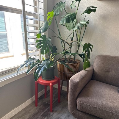 Cute. I’m using it as a plant stand. It’s plastic, very light, but sturdy. I’d say it’s more vibrant in person versus the online photos, where it looked more like a muted clay color to me.