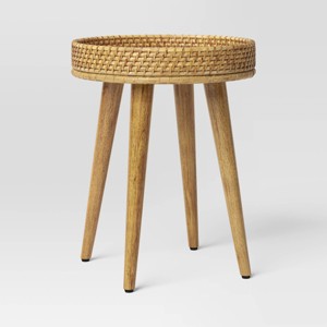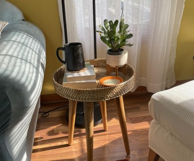A: Hello TG - Thank you for your Question! This Spiral Top Round Accent Table Natural Wood features a 4-leg wood base and an attached tray tabletop made from bamboo and cane with a spiral design. You can place this accent table next to a sofa in your living room or between two chairs to hold a cup of coffee and your latest read. It is recommended to be used indoors. Have a great day! - Eram