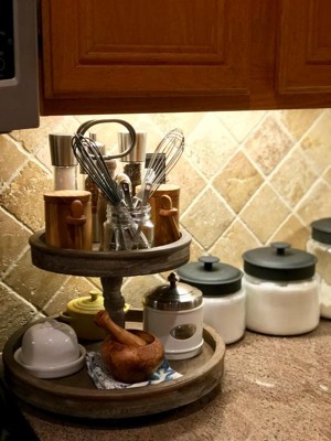 Add a fresh touch of décor to the kitchen with this amazing 2-tier tray. Both trays allow ample space for displaying items. Fill it with spices and easily move to the area of the kitchen they are needed. It will also make a perfect centerpiece for the table. Place a colorful placemat under it and fill the bottom tray with decorative greenery over a row of battery operated lights. Fill the top tray with salt, pepper, sugar and creamer.