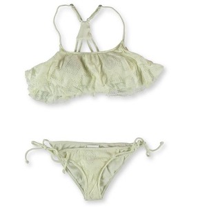 Additional Details: Solid flutter cover bikini swim top Mesh top layer over solid fabric Solid tie side bikini swim bottom Cheeky bottom coverage
