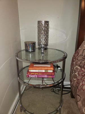 Received my order couple days after ordering. Packaged very securely, NO damaged or broken pieces. Purchased 2 of these chrome & glass end tables for our new home and absolutely LOVE them! Diameter accomodates large based table lamp with room to spare. Height perfect for beverages by couch or recliner, additional shelves allow for decorative items. Overall size not too big or too small, easy to move around room. Definitely recommend these tables....and doing online business with Target. Purchased several household items, small furniture pieces and organizational cabinets from Target and give 5 stars for each order/delivery!!