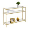 Add modern sophistication to your space with the Royal Crest 3 Tier Glass Console Table with Shelf by Breighton Home. This stylish and contemporary entryway table features three wide, spacious tiers, ideal for showcasing elegant decor or organizing essentials with ease. The clear tempered glass shelves are paired with a sturdy gold powder-coated metal frame, creating a luxe design that blends durability with sleek aesthetics. Perfect for the family room, living room, entryway, hallway, foyer, or beyond, this versatile hall table effortlessly enhances any room. Built to endure, it includes a polishing cloth for simple, low-maintenance care. Complete your home decor with other coordinating pieces from the Royal Crest Collection, each sold separately.