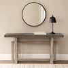 The perfect blend of simple yet dynamic architectural geometry and a homespun farmhouse look, this wooden console sideboard table is designed to bring a remarkable, artful look to your interior decor. With a wide rectangular top and aesthetically pleasing grain details, this piece is dutifully handcrafted from premium grade mango wood for lasting durability and a smooth finish. Its sophisticated distressed matte gray grants a rustic look to the piece as it holds your favorite photos, vases, decorative plants, and more within your foyer, dining room, living room, or anywhere else. The well balanced interlocking geometric base has a clean lined design that allows it to intermingle with a variety of decor settings from modern farmhouse to classic to Scandinavian.