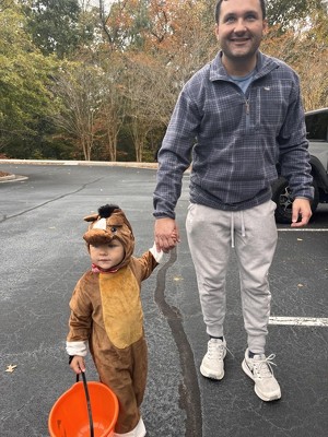 Such a cute costume! It's a little pricey- but Halloween costumes have all gotten so expensive 😩 this one is true to size- my little guy turned 2 last month and the 2T fits him perfectly. The costume is so soft and cozy. We got so many compliments on it at trunk or treat and he absolutely loves it. It really is adorable!
