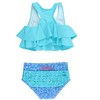 Blue Leopard Flounce Bikini 2-Piece Swimsuit, with Signature Rear Ruffles. Dive into summer fun with this stunning blue leopard bikini designed specifically for girls. This two-piece swimsuit for girls features playful ruffle details and signature rear ruffles, adding a touch of charm to your little one’s swimwear collection. Fully lined for comfort and privacy, the bikini ensures full seat coverage so she can play freely. Crafted with a 4-way stretch fabric that resists pilling and snagging, this girls' bikini with ruffle detail is built to last through every splash and tumble. Plus, it offers UPF 50+ sun protection, keeping her safe from harmful UV rays while she enjoys the pool or beach. Ideal for young swimmers, this girls blue two-piece swimsuit combines style, comfort, and durability in a vibrant blue leopard print that stands out beautifully.