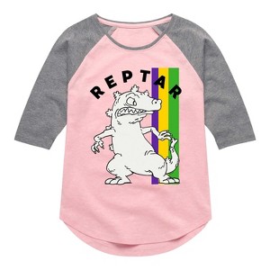 Rugrats - Reptar - Toddler And Youth Girls Raglan Graphic T-Shirt - Embark on a nostalgic adventure with the Rugrats graphic apparel collection! Showcasing beloved characters like Tommy, Chuckie, Angelica, Phil, Lil, and more, each design captures the playful spirit and imagination of the iconic animated series. Perfect for fans of all ages, these pieces bring childhood memories to life with fun, colorful style.