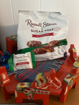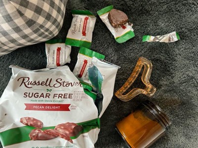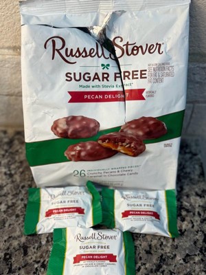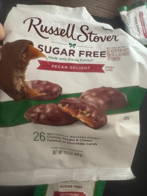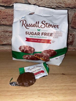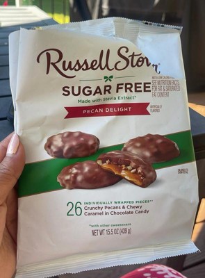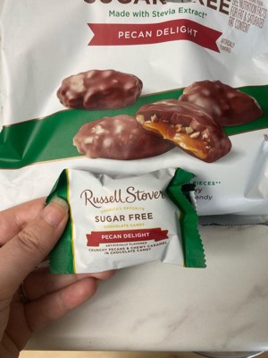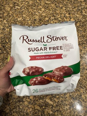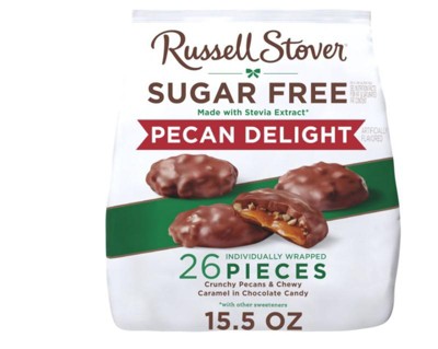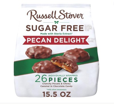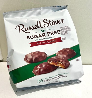 - No sugar, great taste! RUSSELL STOVER Sugar Free Pecan Delights in Chocolate Candy, 15.5 oz., is made with Stevia extract, a plant-based sweetener that delivers all the sweet taste you crave with no added sugar.