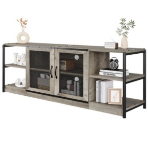1.6M grey rustic TV stand with slatted design, MDF, and iron pipe legs. Spacious top supports medium-sized TVs; open slats add storage/display space. Industrial-rustic style fits living rooms or bedrooms. Sturdy construction ensures longevity¡ªeasy to assemble and clean.