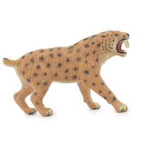 This Saber Tooth Cat, 5" figure includes hand painted features to give it realistic details that are true to natural anatomy. This figure is considered a museum quality replica. Highest Quality Natural Rubber. Saber Tooth Cat is a genus of felids belonging to the extinct subfamily Machairodontinae. It is one of the best known saber-toothed predators and prehistoric mammals. Although commonly known as the saber-toothed tiger, it was not closely related to the tiger or other modern cats. Smilodon lived in the Americas during the Pleistocene epoch (2.5 Mya €“ 10,000 years ago). The genus was named in 1842 based on fossils from Brazil; the generic name means "scalpel" or "two-edged knife" combined with "tooth". Three species are recognized today: S. gracilis, S. fatalis, and S. populator. The two latter species were probably descended from S. gracilis, which itself probably evolved from Megantereon. The hundreds of specimens obtained from the La Brea Tar Pits in Los Angeles constitute the largest collection of Smilodon fossils. Overall, Smilodon was more robustly built than any extant cat, with particularly well-developed forelimbs and exceptionally long upper canine teeth. Its jaw had a bigger gape than that of modern cats, and its upper canines were slender and fragile, being adapted for precision killing. S. gracilis was the smallest species at 55 to 100 kg (120 to 220 lb.) in weight. S. fatalis had a weight of 160 to 280 kg (350 to 620 lb.) and height of 100 cm (39 in). Both of these species are mainly known from North America, but remains from South America have also been attributed to them. S. populator from South America was the largest species, at 220 to 436 kg (485 to 961 lb.) in weight and 120 cm (47 in) in height, and was among the largest known felids. The coat pattern of Smilodon is unknown, but it has been artistically restored with plain or spotted patterns. In North America, Smilodon hunted large herbivores such as bison and camels, and it remained successful even when encountering new prey species in South America. Smilodon is thought to have killed its prey by holding it still with its forelimbs and biting it, but it is unclear in what manner the bite itself was delivered. Scientists debate whether Smilodon had a social or a solitary lifestyle; analysis of modern predator behavior as well as of Smilodon's fossil remains could be construed to lend support to either view. Smilodon probably lived in closed habitats such as forests and bush, which would have provided cover for ambushing prey. Smilodon died out at the same time that most North and South American megafauna disappeared, about 10,000 years ago. Its reliance on large animals has been proposed as the cause of its extinction, along with climate change and competition with other species, but the exact cause is unknown. Thanks for visiting Collectible Wildlife Gifts, the leading provider of high-quality, lifelike animal Designs and gifts! We work hard to ensure we have a diverse range of products. Each product is inspected for their quality craftsmanship. Whether you're searching for a great gift or seeking educational designs for displays, we€™ve got you covered. At Collectible Wildlife Gifts, our products appeal to a wide range of customers, including family, friends, and educators. Our products are trusted and used by professional organizations as well including aquariums, zoos, and movie studios. Our extensive line of products boasts everything from plush sharks to educational animal growth cycles. Our products bring joy to recipients, and serve as valuable educational resources, sparking curiosity and fostering learning. Discover the wonders of the natural world with Collectible Wildlife Gifts. Browse our collection today!