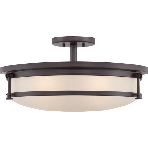 A nautical inspired design that is classic yet simple, the Sailor semi-flush mount light features etched glass that softly diffuses the flow of light. The rich western bronze finish complements it perfectly, adding warmth and style. Sleek metal lines add a touch of modern industrial style, making the ceiling light a perfect option for a variety of transitional interior settings. Hang Sailor in any bathroom, hallway, foyer, or bedroom for ideal ambient lighting.