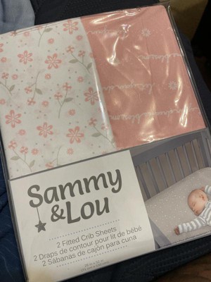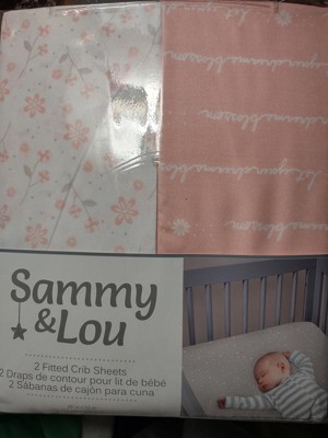 The Sammy & Lou Baby Nursery Fitted Crib Sheets - Floral 2pk features a floral print in light pink and gray on a white background and a “let your dreams blossom” script print in white on a light pink background. The adorable pattern brings a delicate and feminine touch to any nursery. Crib sheets fit a standard 28 in x 52 in crib mattress with 8-inch deep pockets and elastic surrounding the entire opening ensuring a more secure fit. Add the final touch to your nursery bedding ensemble, creating a charming and inviting space for your little one to rest and play! Additional coordinating Sammy and Lou Crib Bedding Separates sold separately.Please adhere to JPMA's Safe Infant Bedding Practices.
