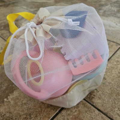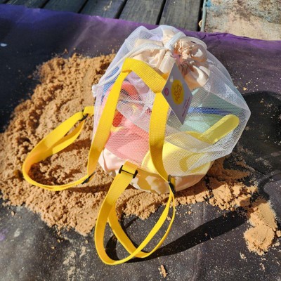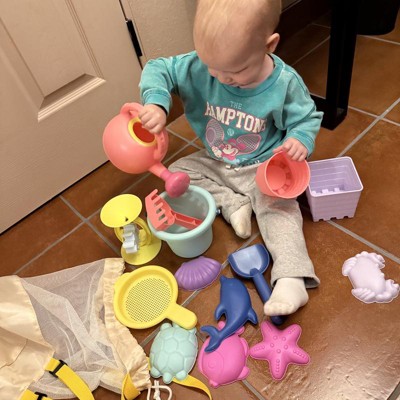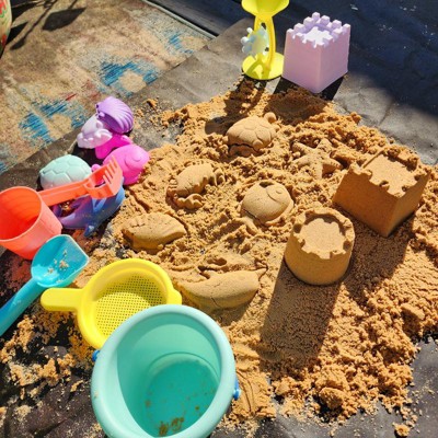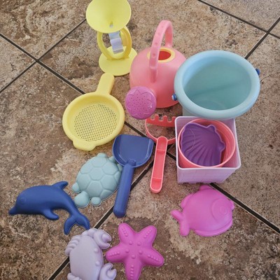 [This review was collected as part of a promotion.] My kiddos were excited for these sand toys and there was enough for all of them to share. While they did indeed use them in the sand box they also used them in an rocky area of our yard and sifted through with the sifter tool to collect small pebbles. The bucket, sandcastles, and watering can are all a sturdy plastic whereas the other tools were a bit less solid plastic. Overall, still an economical and functional purchase. The included mesh bag would be great if visiting a beach so the water and sand could drain out. I received an incentive to write this review.