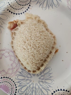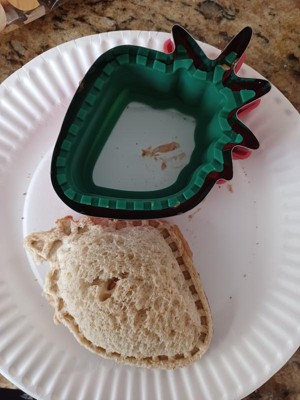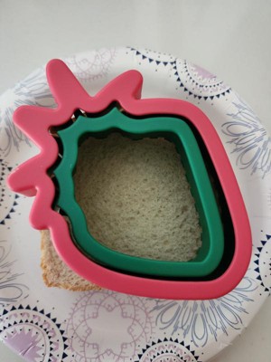 This doesn’t work well at all. Used a thin slices of bread and wouldn’t even cut the whole way through. The stamper doesn’t seal the sandwich either. It made the sandwich puff up really big and still is opening, making it messier than a normal sandwich would be. It defeats the whole purpose. You can barely tell it is supposed to be a strawberry.