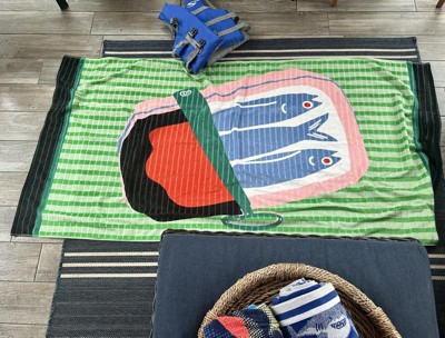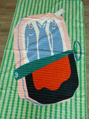 Enhance your beach towel collection with this Sardines Beach Towel from Room Essentials™. Made of 100% cotton terry fabric, this beach towel helps you dry off quickly, and it features a graphic of sardines with green stripes and black borders for an eye-catching look. It makes a perfect pick for beach vacations, pool parties and beyond.