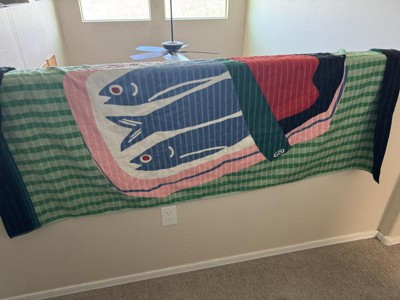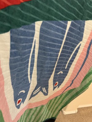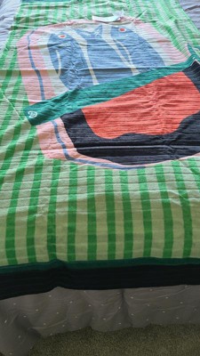 This is an amazing towel. It is very large and heavy, so it’s comfortable to use when you get out of the pool or on the beach. The sardine print is silly, but fun. The kids love it! It’s super simple to wash and hasn’t torn or pulled apart - great quality.