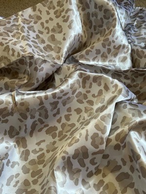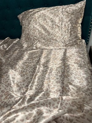 [This review was collected as part of a promotion.] Cute leopard print on satin sheets. Fit nicely on fulll size mattress. Thin satin material that is very slippery, blankets and pillows slide around sheets.