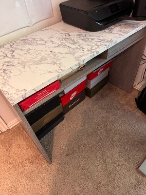 It's called a writing desk. But it's not just for penning letters and thank you notes. Use it as a desk for laptop, homework, paying bills, or whatever project – big or small. This contemporary writing desk from the East Rock® collection is a convenient and compact desk that looks stunning. It features a spacious top surface in a high-wear DuraGraph® faux white marble accent. This writing desk with storage features a drawer with metal runners and safety stops, ideal for holding your pens, sticky notes, postage stamps, or your stash of candy. An open shelf presents the perfect spot to store a laptop. The cord management cut-out on the back side makes this writers desk ideal for charging the laptop, phone, or other electronics. This compact desk is finished on all sides for versatile placement in any room of your home – it will look complete from all angles. With louvered drawer front and a soft Ashen Oak™ finish, this computer desk will look great while you conquer your next task.