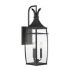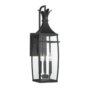 A hint of nature-inspired detailing decorates the top of this Savoy House Montpelier 3-light outdoor wall light. Its slightly curved structure features panes of clear seeded glass and is finished in a classic matte black. Montpelier is 25" in height, 7.50" in width and extends 10" from the wall. It uses 3 candelabra size bulbs with a max of 40 watts per bulb (bulbs not included).