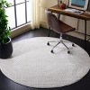 The modern pattern on this round rug exhibits an engaging design that incorporates circular motifs, adding texture and dimension to the piece. Its serene palette and captivating design make it a versatile addition to any room, be it a sophisticated centerpiece in your living room, a cozy accessory in your bedroom, or a chic statement in your office.