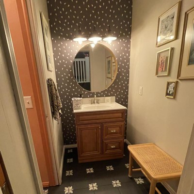 Full disclosure, this was my first time hanging peel and stick wallpaper or dealing with wallpaper at all, so it was a learning process. This wallpaper was very forgiving -the pattern works well without having to worry about lining it up too perfectly. It is also pretty thick so it didn't wrinkle or rip as I was figuring out how to deal with corners. I was able to pull it off to reposition it and put it back on whenever I needed to. It adds a great pattern and color to this small bathroom (picture two is the reflection of the wall from the mirror).