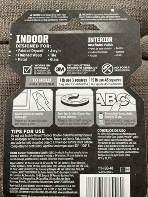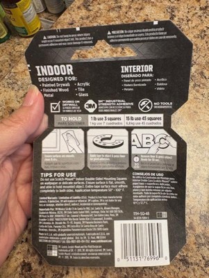[This review was collected as part of a promotion.] I give the Scotch-Mount Indoor Double-Sided Mounting Squares high marks because they are extremely easy to use (it’s a matter of literally peel and stick) and can hold up to 15 pounds (the heavier the item though, the more squares needed). However, as the package indicates, this uses permanent adhesive so really can’t be used on anything you don’t want to permanently hang, such as artwork, photos and other decor. So I’m not sure how many things you would want to use this product for indoors. But on the positive note, it can be used on many surfaces, including paint, drywall, metal and tile, and no tools are needed. 3M/Scotch provided this product for my honest, unbiased opinion.