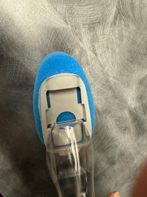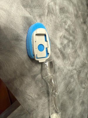 - When it is time to change the head, hold the dishwand with head facing up. Push tab away from handle, slide refill off and push forward to remove. Slide new head onto handle and click into place