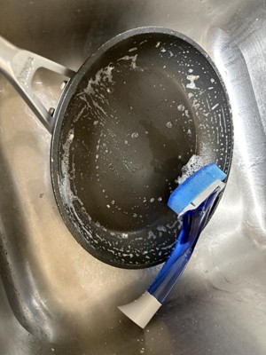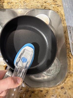 [This review was collected as part of a promotion.] This dishwand is gentle so it's been great to use on my non stick pans without having to worry about them getting scratched. The best part is the well that holds soap. It makes cleaning even easier when I don't have to find the soap before I start. It's super quick to wet the sponge and use it.