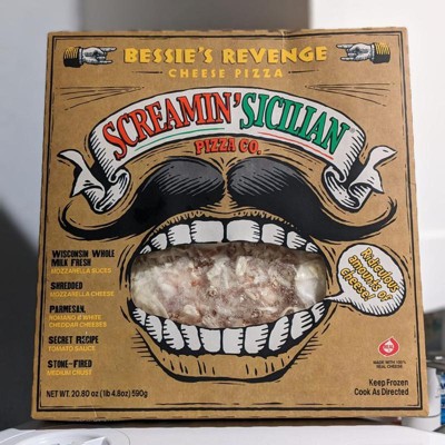 [This review was collected as part of a promotion.] Bessie's Revenge by Screamin' Sicilian is a good cheese pizza overall. I have purchased this product a few times and always had consistent quality until now. This pizza seemed to have gotten very warm during transit, and then refrozen in a different position. I did cook the product in order to review its look, but it's not recommended to eat frozen pizza that has clearly been unfrozen and refrozen! The Bessie's Revenge is very cheesy with slabs of mozzarella as well as shreds. It has a sweeter red sauce. The crust is not too thick or too thin. It's Wisconsin cheese.