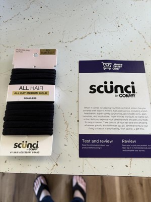 [This review was collected as part of a promotion.] The best Hair Ties I love these Hair Ties. I have them in Nude to blend with my blond hair but I don’t mind the black. They don’t tear your hair, when i have my hair down I usually put the hair tie on my wrist and they don’t cut off my circulation and they smooth with no seams. They hold my pony tail in place for hours. I also put my hair up in a bun often and they hold my bun in place with no extra pins. I honesty don’t think I’ll ever buy any other type of Hair ties as long as I have hair. Scunci by Conair has made me a life long Customer.