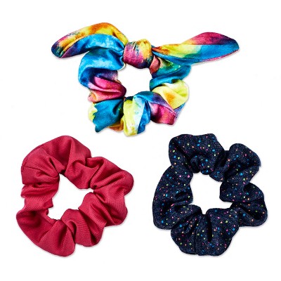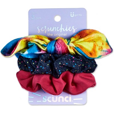 Scunci, creator of the original scrunchie, continues to update the iconic hair accessory. This 3pk features includes a rainbow-colored bow tie, one patterned and one solid scrunchie. Tie them around basic ponytails to spice up your style, add them to the ends of braids, or beautify a bun with the greatest of ease.