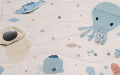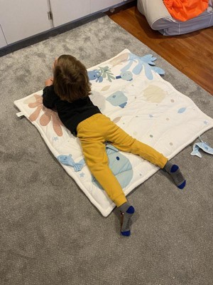 Beautiful watercolor under the sea play mat! The mat is decently thick and creates a nice padding on the floor. There are different textures and fabrics for baby to touch and feel. The plush material is so soft and cozy my toddler has claimed the mat as his own!
