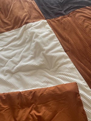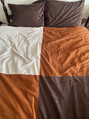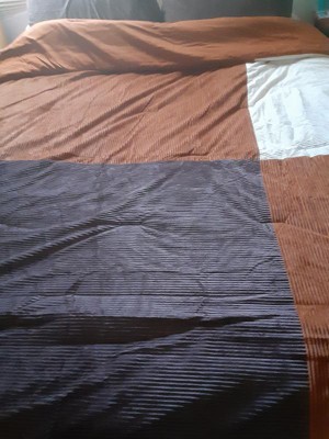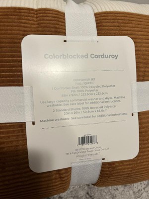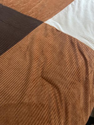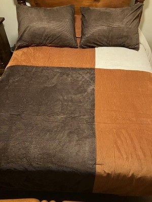 This is a lovely color blocked corduroy comforter set that looks really nice on our sons queen-sized bed. The colors are brown, white, and a burnt orange-like color combination. My son is a teen and has outgrown his themed type comforters and this set is perfect for any young man. The corduroy material feels very soft, which makes this comforter very comfy. This set washes very well and came out of the dryer without wrinkles. Nice quality comforter at an affordable price.