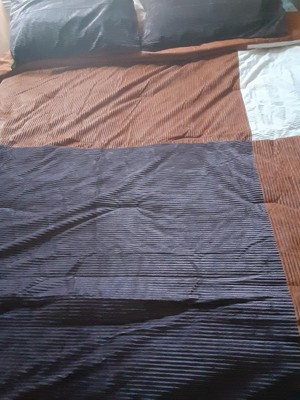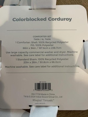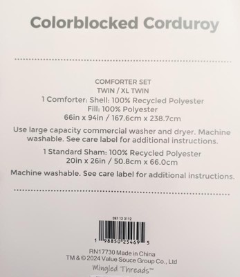 The Mingled Threads Seek Corduroy Comforter is a standard comforter that has a comfy, corduroy material on the outside and a cotton sheet type of feel on the interior. This comforter has an interesting colorblock design that definitely is an acquired taste.