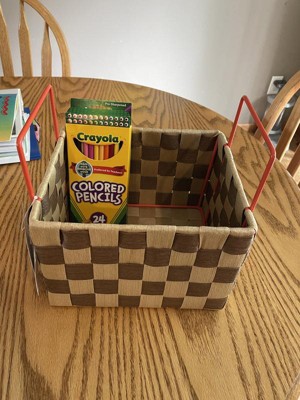 This is a cute little crate. I like that it is sturdy and quite deep. The colorful orange handles add a fun pop of color. I use this in my office to store cards and it looks great up on my shelf. Good quality little tote basket!