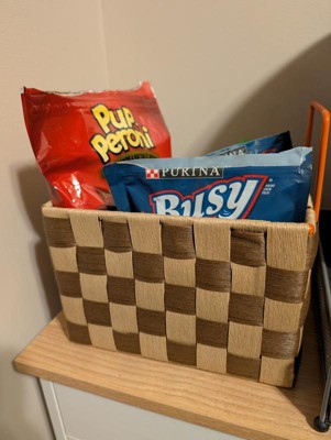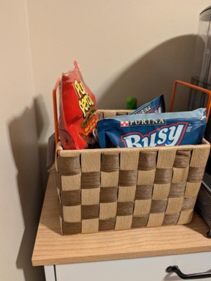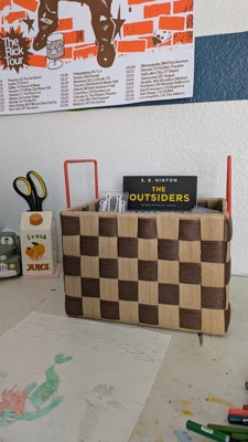 I am loving this small checkered storage bin. It is very sturdy and durable. The pattern is very cute as well. I am currently using this storage bin to hold my dog's treats. Although it is considered a small bin it holds a lot.