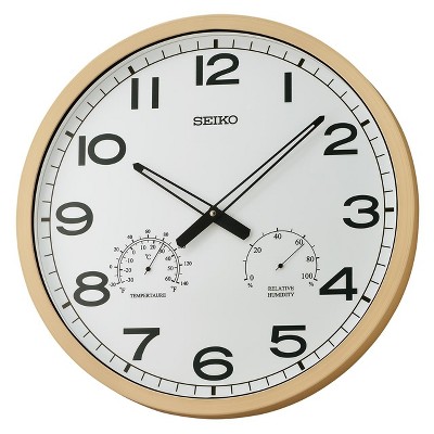 The Seiko Wall Clock combines oversized style with everyday functionality, making it the perfect accent for your deck, patio, sunroom, or indoor living spaces. Built with a splash resistant design, this versatile wall clock is available in two timeless styles choose a bold black frame with classic Roman numerals or a warm tan frame with easy to read numerals. Featuring builtin temperature and humidity gauges, youll always know the time and weather conditions at a glance. Powered by Seikos precision quartz crystal movement, this clock delivers accurate, reliable timekeeping indoors or outdoors.