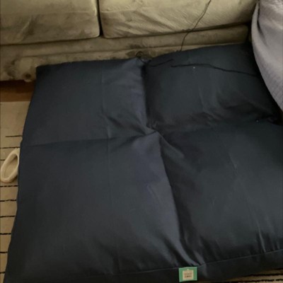 We love this! Our son loves this, one of our dogs, and we do. So many options to use this. It comes with four super thick cushions to go inside the cover which has a section for each to keep them from slipping around. It would definitely be better if this had a handle or two on it as it’s quite large and awkward to carry to a second floor. Someone asked if you could connect this to another one, but the way the velcro closes you could connect another pad to it. I just think you’d need it to be on a carpet so it didn’t slide around and easily pop apart. It’s pretty heavy, so I think it would definitely be touch to do.
