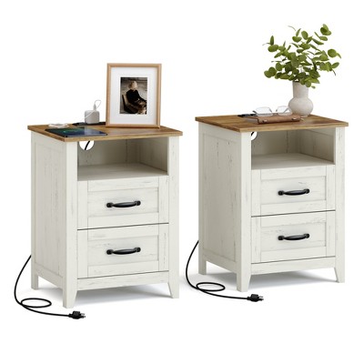 Set of 2 Farmhouse Nightstands with USB Charging - 2-Drawer Bedside Tables, Rustic Modern Design