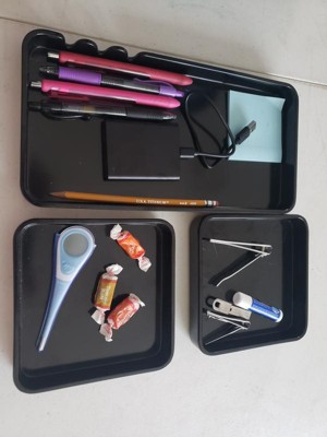 When I read the description of this item I wasnt quite sure what they would fully look and feel like but I really like these trays. They are sleek and heavy duty. They are the perfect size for quite a few different options of organizing smaller items. I needed a small tray to organize my nail clippers and tweezers that i keep close to my chair because they are so handy as a mom for so many different applications and one of the small trays are perfect for the job. The other trays are going on my desk to keep my office supplies handy! I also really like how they stack so neatly and you can still have items in the bottom tray while stacked.