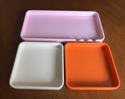 [This review was collected as part of a promotion.] This three-piece tray is great for organizing any space. The top two trays go together to sit on top of the bottom tray which is larger. The trays are each a different color. The bottom one is a pink in the top, orange and white. These trays can hold quite a bit all together. The top two trays are about 5” x 5” in the bottom tray is about 10” x 10”. My daughter uses these to help organize her make up on top of her vanity. I received an incentive to write this review.