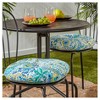 Add a bit of comfort and style to your outdoor dining set with these Bistro Cushions from Kensington Garden. Cushions feature a center circle tack which prevents fill from shifting and bunching, and two string ties to keep cushions firmly secured to chairs. Each set includes two 15 inch round seat cushions made from a 100% polyester fabric that is fade, stain and water resistant. The cushion's soft poly fiber fill is made from 100% recycled, post-consumer plastic bottles, and overstuffed for added comfort, strength and durability. A variety of color and pattern options are available to coordinate with your outdoor decor.