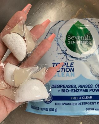 [This review was collected as part of a promotion.] Seventh Generation Triple Action Clean Dishwasher Packs clean dishes effectively without harsh chemicals. They cut through grease, leave no residue, and work well even on tough loads. The 16ct pack is convenient and eco-friendly. A reliable green choice.