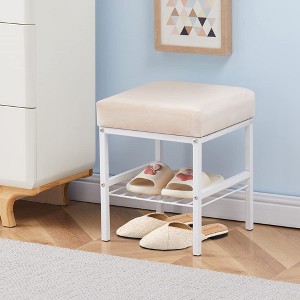 SEVOBAL Ottomans and Benches introduces an elegant vanity footstool featuring plush velvet upholstery and modern metal legs. The high-resilience foam cushion ensures comfortable seating while the bottom shelf provides practical storage solutions. With anti-slip protection and sophisticated champagne finish, this multifunctional stool enhances dressing rooms, bedrooms, and living areas with both style and utility for everyday use.