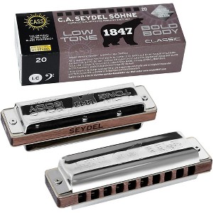 The Seydel Blues Classic 1847 harmonica is first serial-produced Richter-diatonic harmonica with stainless steel reeds. It represents many innovations. but fits all traditional demands - a master's instrument for maximum ambitions. The 1847 is the result of Seydel's 160 year of experience in manufacturing high-quality harmonicas.Key Features• Full and loud, overtone-rich sound and extremely fast tone-response due to stainless-steel reeds• Very long durability and even with heavy-duty playing—stainless steel reeds and stainless-steel rivets• Less air-loss due to fine-cut reedplates—optimized flatness and extremely small tolerances between reed and reedplate• Beard- and lip-friendly—coverplates with rounded edges without any cuts at the mouthpiece and ergonomic built hole openings and rounded dividers• The overtone-rich sound can spread out undampened—covers made of extra strong stainless-steel sheet (.4 mm), opened wide at the back and crimped and therefore a good stability and rounded edges•Moisture-proof, swelling-free maple-comb, sealed with multiple layers of food-safe finish
