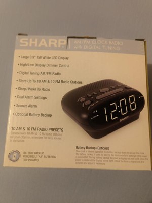 The Sharp Digital Alarm Clock with AM/FM Radio & Dual Alarm offers the option to switch between a beep alarm or the last listened to radio station to wake up by. Listen to the radio and store up to 10 AM and 10 FM radio stations. Want to relax listening to music before you sleep? Use the sleep function to have the radio automatically turn off to the selected time. This clock is electric operated; the battery backup does not power the clock. The battery backup is used for storing the time and alarm settings if the power is interrupted. During battery backup the clock' s display will not be lit. Once the power is restored the display will re-light. Check the time to make sure it is accurate and adjust if necessary.
