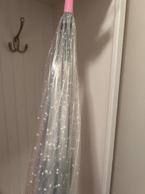 This umbrella is so durable. My daughter was using this umbrella during a storm and the umbrella didn’t turn inside out like so many of the umbrellas around us. Also it makes it easy to stay dry when you can see through this clear umbrella with cute little dots. This umbrella has a push to open button that is really useful when you’re in a hurry.