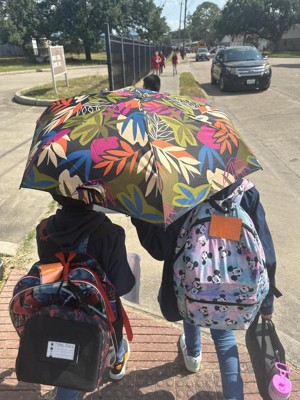 I received this item for free in exchange for my opinion. This umbrella is small and can fit in the side pocket of a child's backpack or in someone's purse or bag. It's colorful, too, and isn't too difficult to close. Sometimes the "legs" or sides of the umbrella get stuck in the handle and can make it difficult to get out to open it, but it doesn't happen all the time. This umbrella is enough to cover one person but would not also cover someone's backpack and is not big enough to cover two people.