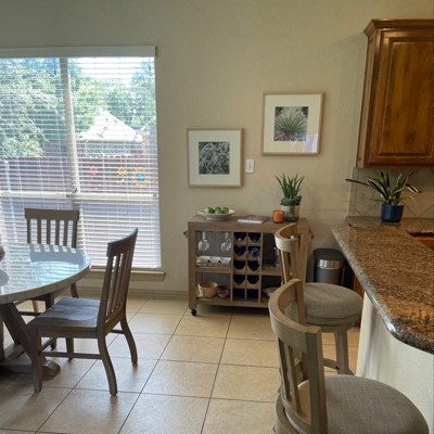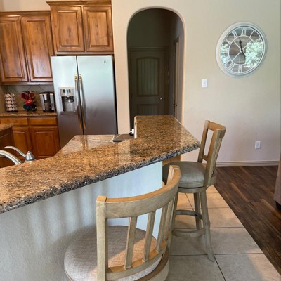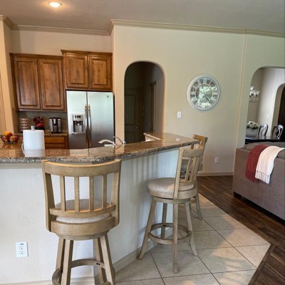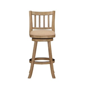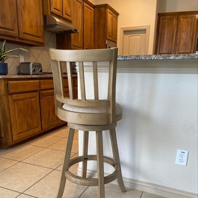 The Sheldon Swivel Stool is sure to fit perfectly into any space: from dens and game rooms to kitchens and home bars. This sophisticated counter stool is crafted from eco-friendly rubberwood that's finished in a multistep wire-brush process. Linen upholstery with single welt trim hides the plump high-density foam cushion. A slat back adds style while the full-ring footrest and flared legs bring stability and comfort. A protective metal kickplate ensures your feet don't scuff or scratch the wood. Also available in 29-inch bar height seating.