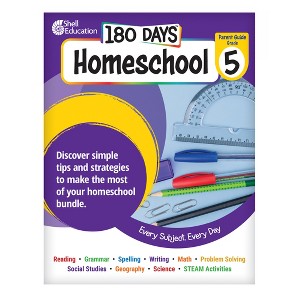 Shell Education 180 Days™: Homeschool Grade 5 Set | Encourage your fifth grader’s growth in reading, math, science, social studies, and more. Set your fifth grader up for success with this all-in-one homeschool collection featuring books, flashcards, conversation card activities, and a Parent Engagement Guide. Covering every core subject along with enrichment opportunities, this thoughtfully designed set offers structured daily practice, meaningful skill development, and interactive learning. With the added support of the Parent Engagement Guide, parents gain tips and strategies to make homeschool learning productive, positive, and engaging—ensuring consistent growth and sparking a lifelong love of learning. In this bundle: Grade 5 Parent Guide, 180 Days™: Reading for Fifth Grade, 2nd Edition, 180 Days™: Language for Fifth Grade, 180 Days™: Spelling and Word Study for Fifth Grade, 180 Days™: Writing for Fifth Grade, 180 Days™: Math for Fifth Grade, 2nd Edition, 180 Days™: Problem Solving for Fifth Grade, 180 Days™: Social Studies for Fifth Grade, 180 Days™: Geography for Fifth Grade, 180 Days™: Science for Fifth Grade, 180 Days™: Hands-On STEAM for Fifth Grade, Cursive Practice Flash Cards – 56 cards with learning prompts, Multiplication Flash Cards – 56 cards with learning prompts, Division Flash Cards – 56 cards with learning prompts, Figurative Language In a Jar® – 101 cards for practicing similes, idioms, and metaphors, 180 Days Homeschool bundles are available for every grade from kindergarten through 6th, so you can nurture your child’s learning journey year after year with the same trusted support.